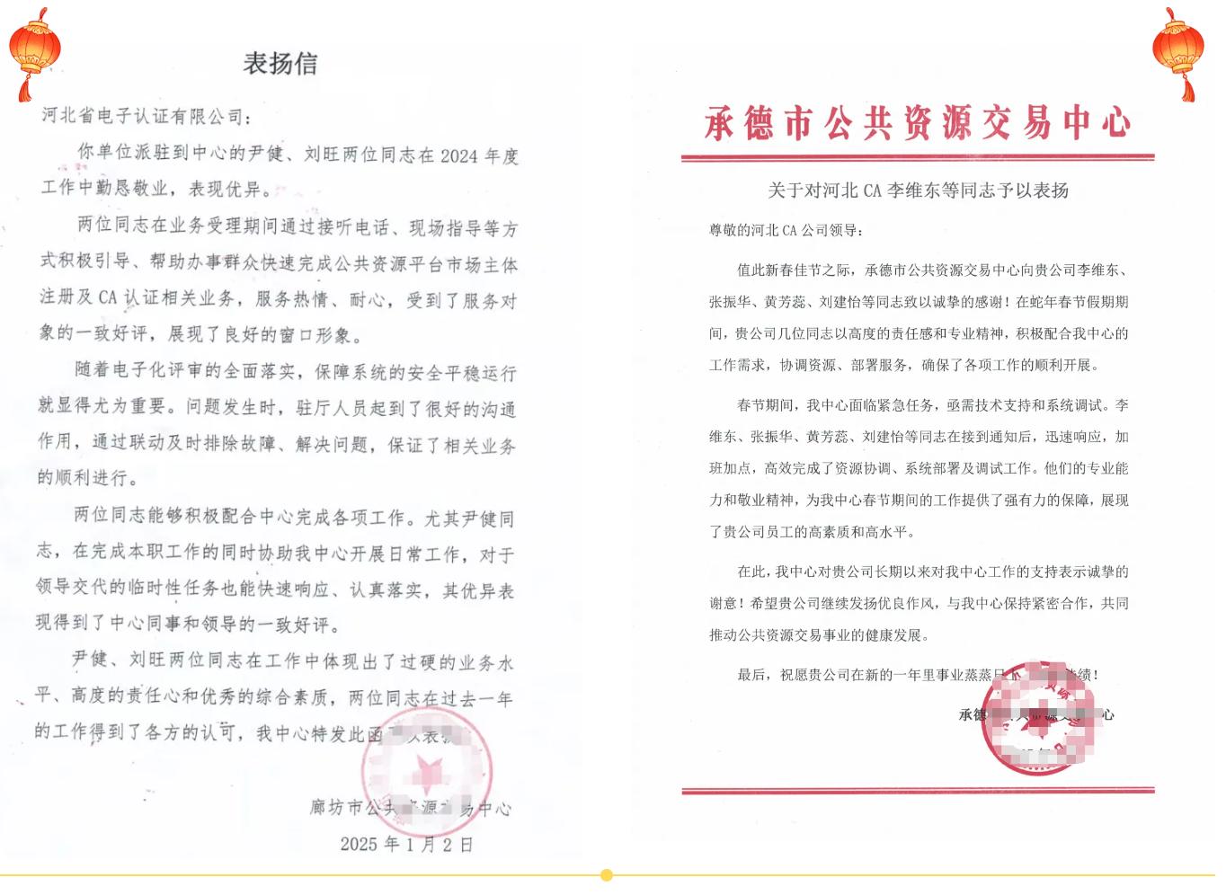 “勤懇敬業(yè),服務熱情”,這是來自廊坊市公共資源交易中心送來的表揚信上的話語。尹健、劉旺兩位同志在業(yè)務受理期間通過接聽電話、現(xiàn)場指導等方式積極引導、幫助辦事群眾快速完成公共資源平臺市場主體注冊及CA認證相關業(yè)務,服務熱情、耐心,受到了服務對象的一致好評,展現(xiàn)了良好的窗口形象。承德市公共資源交易中心同樣送來了表彰,“劉建怡、張振華、李維東、黃芳蕊等同志細致入微的堅守為我中心春節(jié)期間的工作提供了強有力的保障,展現(xiàn)了貴公司員工的高素質和高水平。”正是這份“急客戶之所急,解客戶之所難”的初心,讓我們收獲了這份沉甸甸的認可。